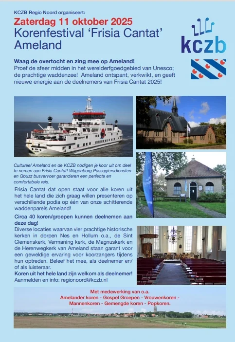 Op 11 oktober 2025 zal popkoor Leek meerder malen optreden op het Korenfestival Frisia Cantat te Ameland. Maak er een gezellig weekendje weg van op deze fantastische locatie en kom genieten van de verschillende koren die komen optreden op het festival.